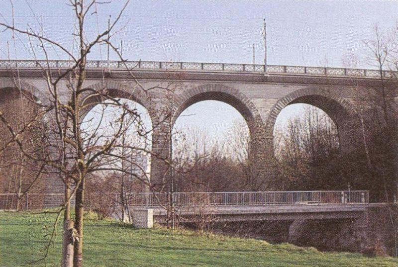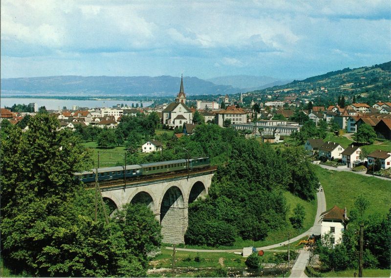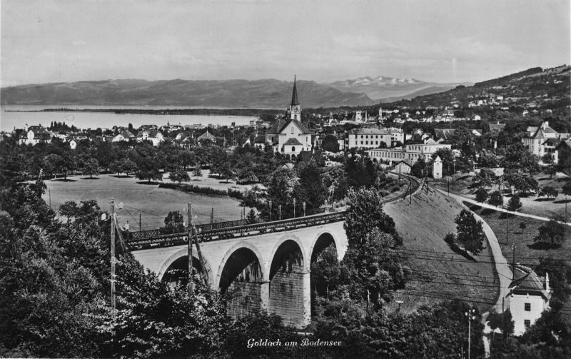 Nur knapp einen Monat nach der Freigabe der ältesten, heute noch betriebenen SBB-Eisenbahnbrücke über die Reuss (Linie Zürich—Olten) bei Turgi im Kanton Aargau (September 1856 — Spannweite 73 m) fuhren die ersten Züge auch über den Goldach-Viadukt (25. Oktober 1856 - Spannweite 104 m). Das Aufsehen, das diese Brücke in der Ostschweiz machte, war beachtlich. Johann Baptist Isenring (1796— 1860) wählte als erster die Eisenbahnbrücke kurz nach ihrer Vollendung zu «seinem» Goldacher Motiv und liess mit dem Prospekt von Brücke, Kirche, Dorf und Bodensee eine Ansicht stechen (1855/56), die bis heute als «Wahrzeichen» der Bodenseegemeinde Gültigkeit beansprucht, kunstgeschichtlich gesehen aber einem markanten Zeugnis des Pioniergeistes der Schweizer Gründerzeit alle Ehren erweist.