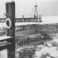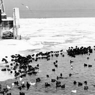 7. Februar. Der zugefrorene Bodensee ist das meteorologische Ereignis des Jahrhunderts! Die letzte Bodenseegfrörni ereignete sich im Winter 1880. Trotz eindringlicher Warnungen wagen sich bereits ein paar Burschen auf die Eisfläche hinaus. Die Fluggruppe der Flug- und Fahrzeugwerke Altenrhein hilft den bedrohten Wasservögeln mit Flügen zur Fütterung der hungernden Vogelschwärme auf dem großen weiten Eis. Die tierfreundliche Bevölkerung unterstützt diese Hilfsaktion durch Lebensmittelspenden aller Art.